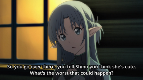 Asuna: You go over there, you tell Shino you think she’s cute. What’s the worst that could happen?